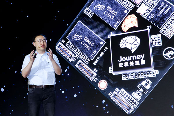 Yu Kai, CEO of Horizon Robotics Inc, unveiled its AI processor Journey in Beijing on Wednesday. [Photo provided to chinadaily.com.cn] |