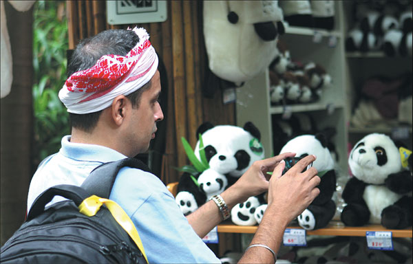 A visitor takes photos of giant panda toys in Chengdu, the ancient hometown of the giant panda. Photos Provided to China Daily |
