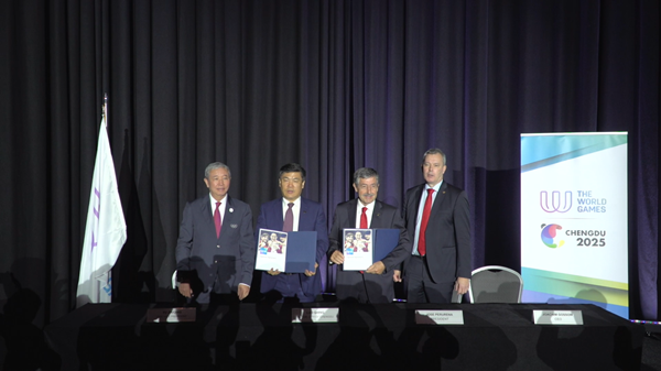 Chengdu Mayor Luo Qiang and IWGA President Jose Perurena signed the organizer agreement with Yu Zaiqing, vice president of the International Olympic Committee (IOC) and the Chinese Olympic Committee, serving as the witness.
