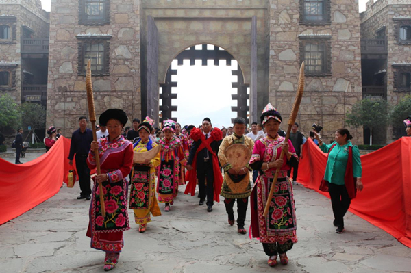 The Ancient Qiang City of China in Maoxian county, Aba Tibetan and Qiang autonomous prefecture, Sichuan province holds a traditional gate-opening ceremony every morning to welcome visitors. [Photo provided to China Daily] |