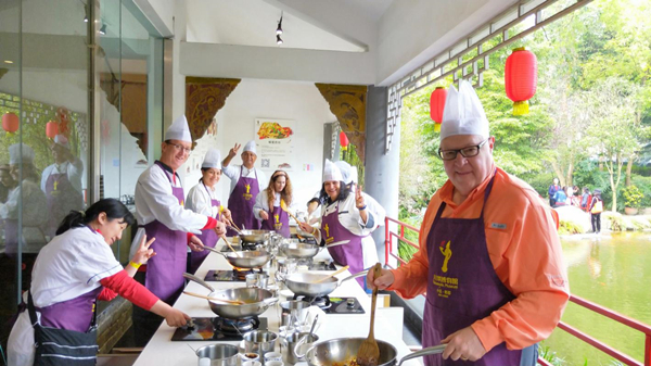Travel consultants, travel writers, and journalists from countries including the United States, Canada, and the United Kingdom learn to make Sichuan cuisine in Chengdu. [Photo provided to China Daily] |