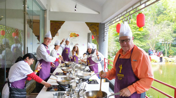Foreign professionals cook dishes at a recent promotional event for the culture and tourism of Chengdu. [Photo provided to China Daily] |