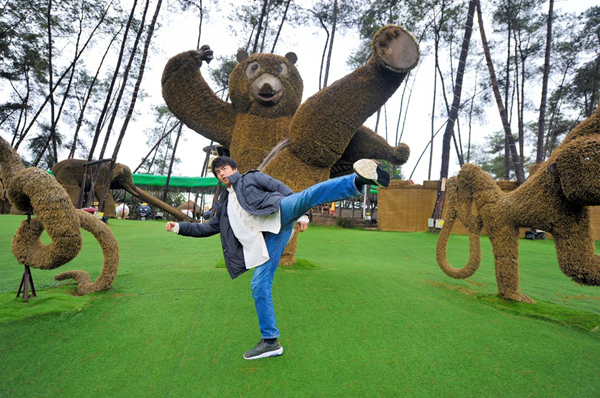 A man imitates gestures of a Kung Fu Panda sculpture in Chengdu. [Photo provided to China Daily] |