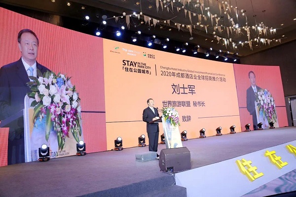 Liu Shijun, secretary-general of the World Tourism Alliance (WTA), delivers a speech at the 2020 Chengdu Hotel Industry Global Investment Promotion Conference. [Photo provided to China Daily] |
