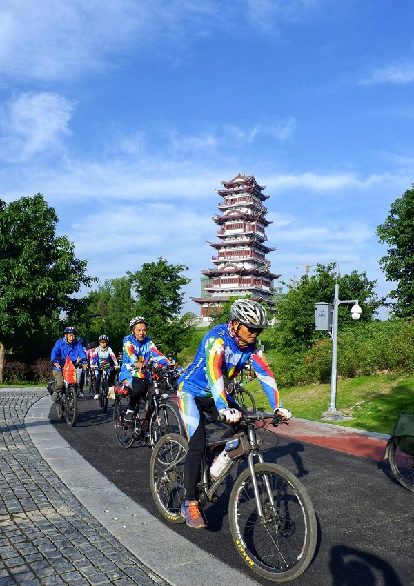 Citizens ride bicycles on the greenway at Aoshan Park in Jianyang, Chengdu. [Photo by Zhou Xue/For China Daily] |