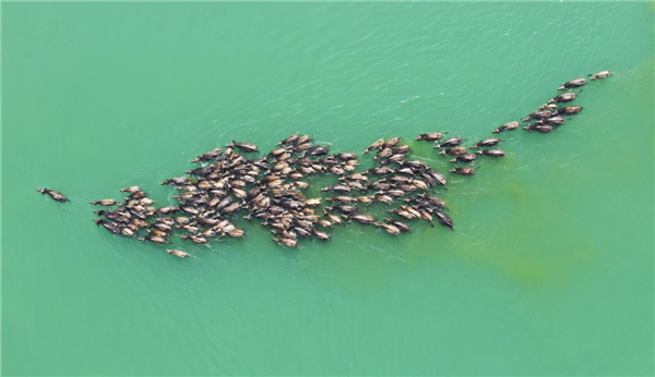 A herd of cattle crosses the Jialing River towards an island to forage for grass on April 30. This grand scene occurs in Peng'an county, Sichuan province, and happens daily from April to October. [Photo by Guo Anping/For China Daily] |