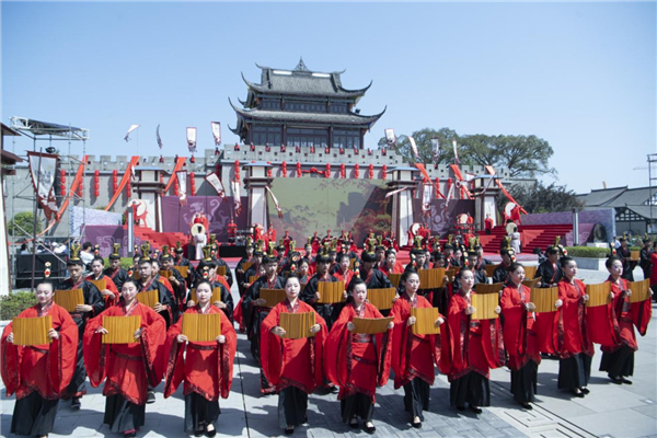 A ceremony to celebrate the opening of the newly restored Xiangru Ancient Town, hometown of Sima Xiangru (179-118 BC), a statesman, poet and musician in ancient China, is held on April 30.[Photo by Guo Anping/For China Daily] |