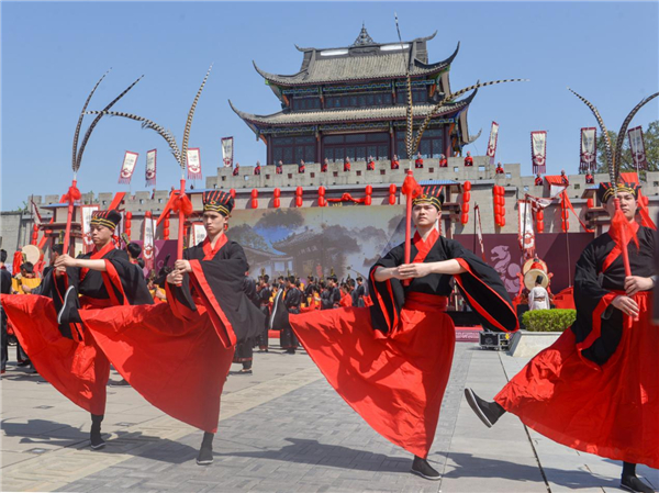 A ceremony to celebrate the opening of the newly restored Xiangru Ancient Town, hometown of Sima Xiangru (179-118 BC), a statesman, poet and musician in ancient China, is held on April 30.[Photo by Peng Shengzhou/For China Daily] |