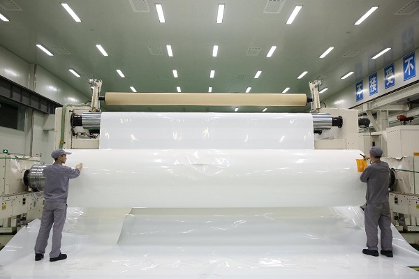 Staff members work at the workshop of Sichuan EM Technology Co Ltd, a professional global material manufacturer based in Mianyang, Sichuan province. [Photo provided to China Daily] |
