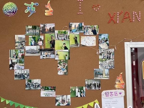 Photos of athletes, coaches, referees and reporters are showcased on the photo wall of the volunteer service center at the National Games Village for China's 14th National Games.