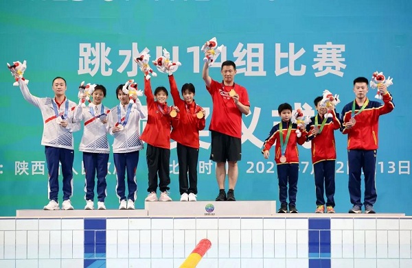 The U14 (under 14 years old) group diving competition of China's 14th National Games was held at the diving and swimming hall of the Xi'an Olympic Sports Center on July 12 – where the battle for the games' first gold medal was in contention.